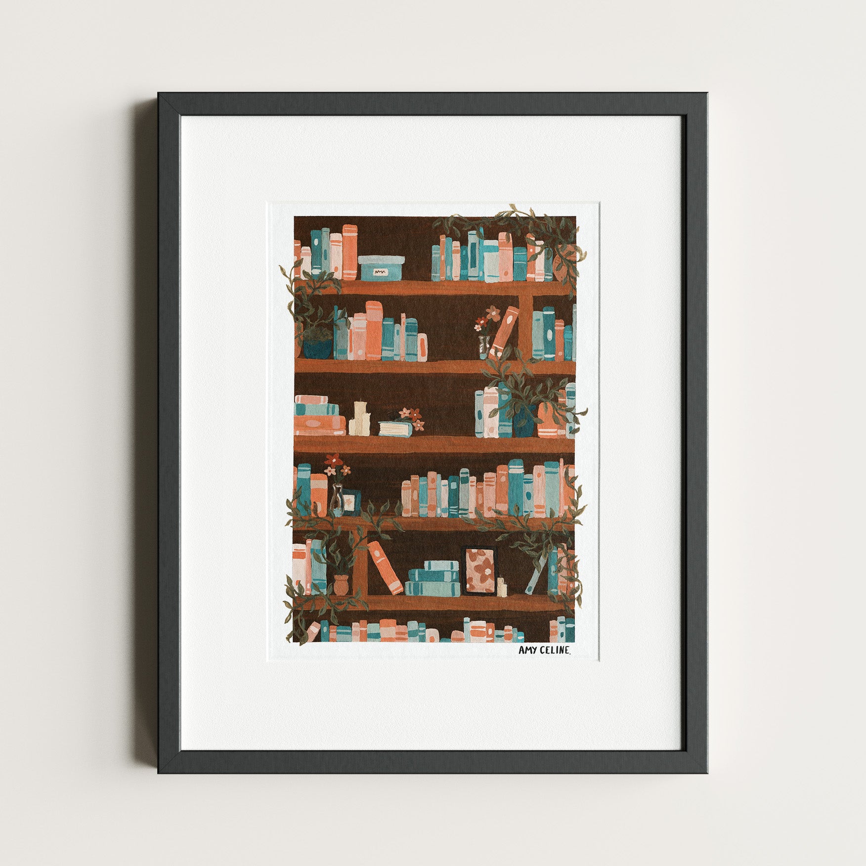 Inviting a cosy space to pick up a book and unwind, this sweet scene shows a wooden bookshelf filled with books and lush plants. This print celebrates the quiet comfort and endless stories held within a beloved personal library, intertwining nature's embrace with the warmth of well-read pages.